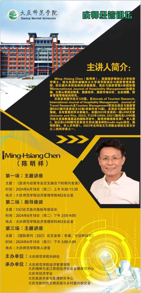 6月18日—6月19日,应滚球买球的app官网邀请,美国华盛顿州立大学商学院酒店与旅游管理系教授陈明祥(Ming-Hsiang Chen)博士来我校做了三场学术报告。本次学术活动由校科研处主办,滚球买球的app官网、大庆精神与龙江西部经济社会发展研究中心、大庆市经济学会、大庆旅游开发与管理研究中心、大庆市新时代文明实践与乡村振兴研究会承办。各学会、齐齐哈尔大学、东北石油大学、黑龙江省八一农垦大学及我校师生近200人次参加。