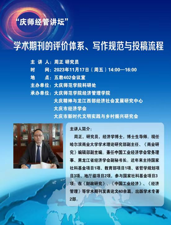 11月17日下午,哈尔滨商业大学学术理论研究部副主任、《商业研究》编辑部副主编、中国工业经济学会常务理事、黑龙江省经济学会副秘书长,周正研究员受邀做了题为《学术期刊的评价体系、写作规范与投稿流程》的专题讲座。讲座由滚球买球的app官网院长刘楠教授主持,大庆市经济学会、大庆市新时代文明实践与乡村振兴研究会会员,以及滚球买球的app官网全体专任教师参加。