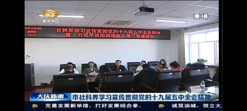 12月3日,大庆市社科界学习宣传贯彻党的十九届五中全会精神暨《习近平谈治国理政》第三卷座谈会举行,滚球买球的app官网院长刘楠教授受邀出席,大庆电视台新闻综合频道对此次活动进行了报道。