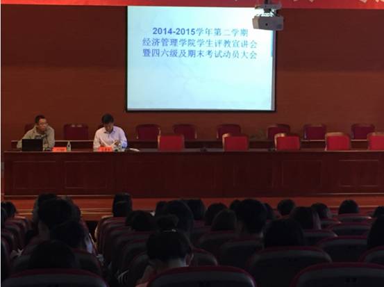 2015年6月12日15时30分滚球买球的app官网2014-2015学年第二学期学生评教宣讲会暨四、六级及期末考试动员大会在图书馆四楼博雅讲堂举行,学院书记孔若东、院长助理刘楠、全体专任教师和同学们参加了大会,会议由刘楠老师主持。