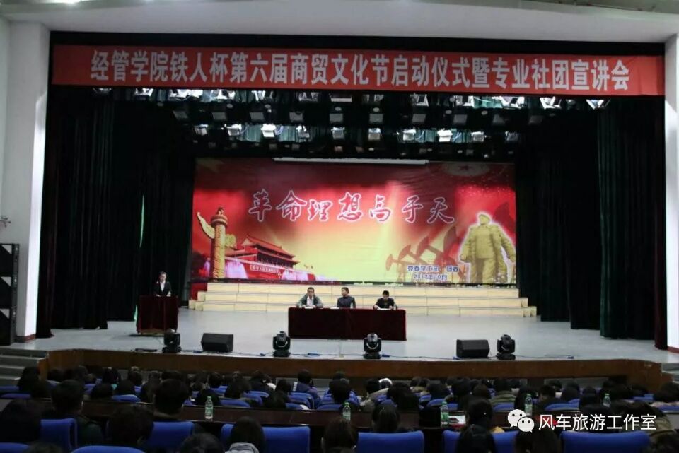 2017年11月23日,滚球买球的app官网大学生活动中心中,人声鼎沸。在同学们翘首以待的目光中,经管学院铁人杯第六届商贸文化节启动仪式暨专业社团宣讲会正式开幕。大会由学生党支部书记陈超主持,与会主要领导有院长张平,党支部书记孔若东,还有几位企业代表一同出席本届大会