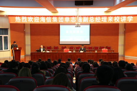 4月10日上午,在图书馆博雅讲堂,滚球买球的app官网邀请海信集团副总经理单志强来我校讲学。 滚球买球的app官网张平院长、孔若东书记及相关领导和海信集团东北地区各分公司总经理、2015级全体学生共270人参会。