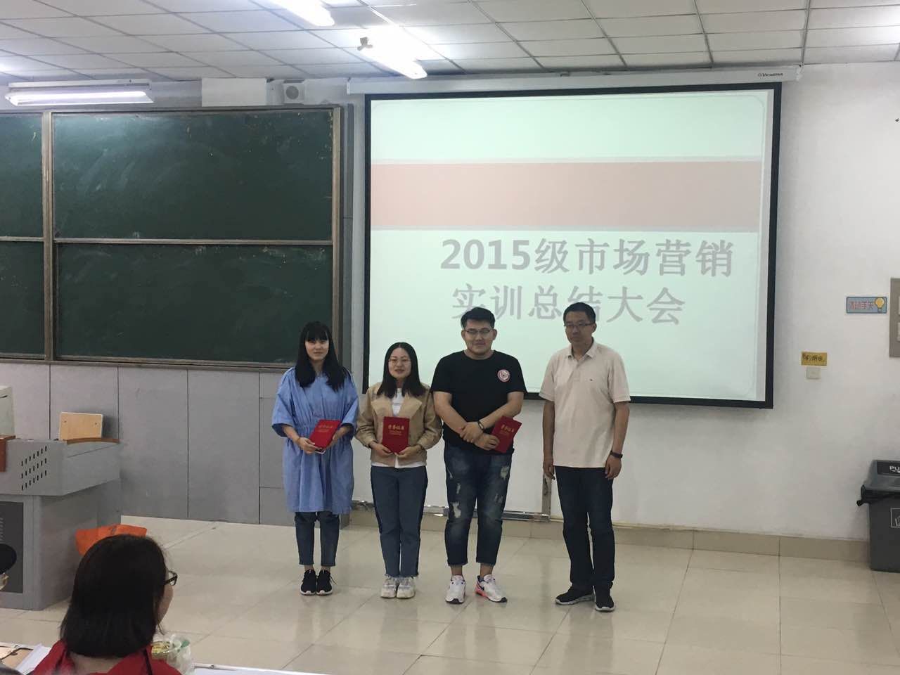 2018年5月25日,在2015级市场营销专业为期三周的实训结束之时特举行了实训总结大会,会议由市场营销系主任尚德萍主持,副院长刘楠,实习指导老师王剑、姜鹏、秦东梅、徐珉钰、于珊珊等参会。根据人才培养方案要求,本学期2015市场营销专业包含供应链实训和行业营销与产品推广实训课程。为了更好的锻炼学生的实践能力并在实习和就业中更好的展现自己,此次实训特聘请了多位校外各行业的专家,七天连锁酒店张伟东经理、礼仪培训师丛辉、江海证券经理朱吉等给学生做各行业的职业岗位培训和职业技能培训和实操,经过三周的实训,学生在职业礼仪、营销推广、证券理财等方面都有了进一步的认知和提升,经过校企双方的协商,特给予在实训中综合表现较好的学生评出一等奖三名:张景晗、李丰秋、苑可欣;二等奖三名:韩嘉琪、魏斯朝、孙宇;三等奖三名:杜鹃、张艺菲、庄彩欣,并对这九位同学进行了表彰和奖励,奖金分别为300元、200元和100元(奖金由7天酒店赞助),副院长刘楠和各位指导老师给各位同学颁奖并鼓励。会议最后刘楠院长对学生在实训中的表现给予了充分肯定并在未来的实习中提出各项要求和希望。