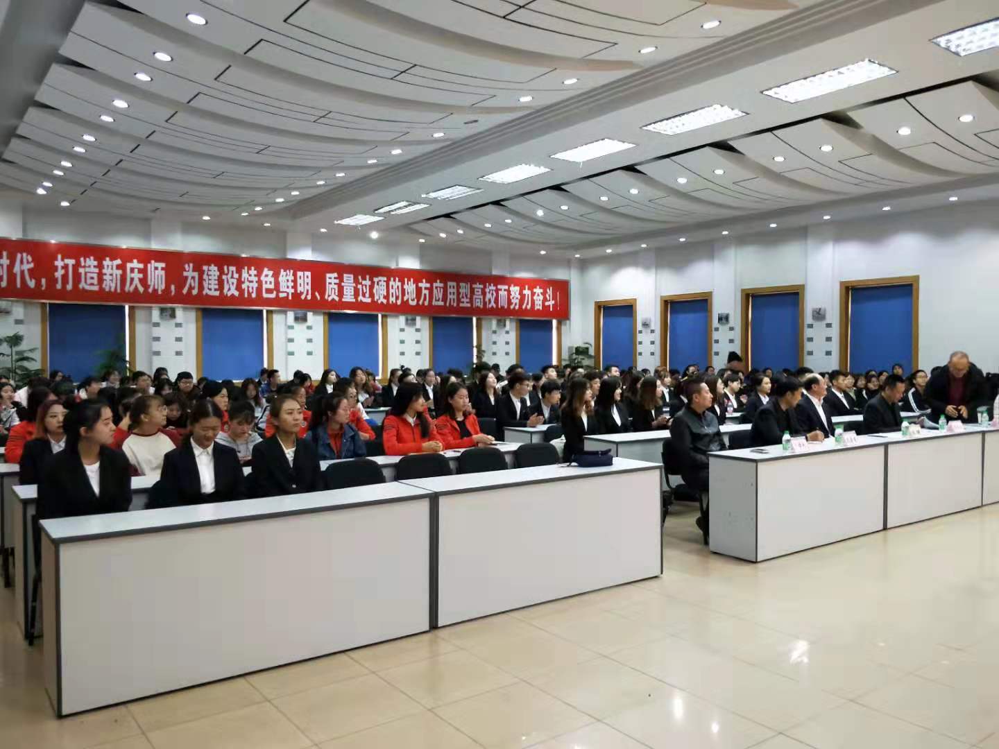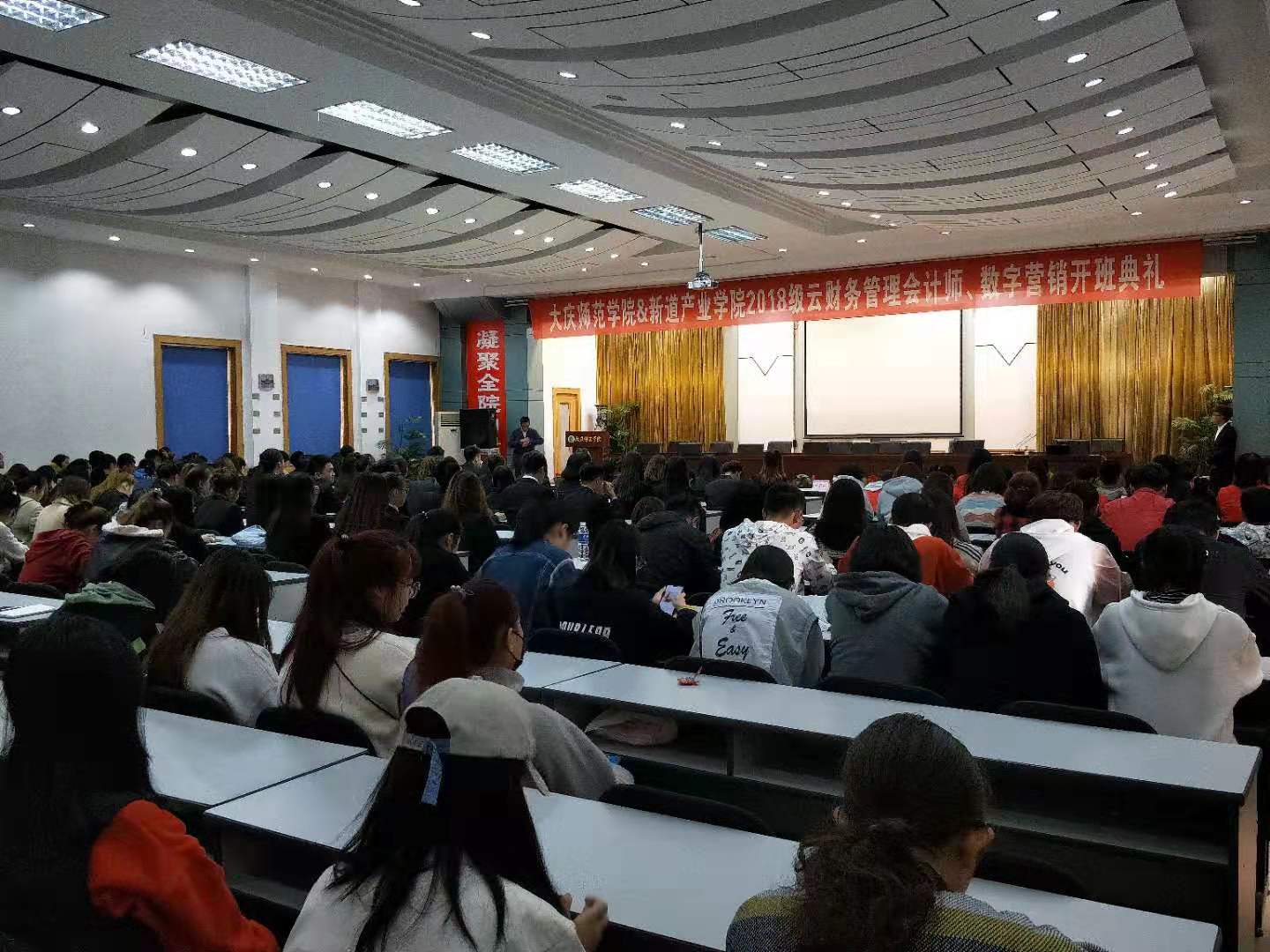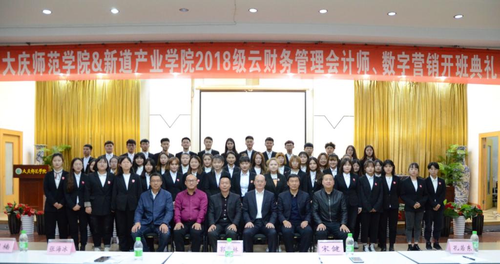 产教融合培养应用型经管类人才,我校与新道科技有限公司合作,于2019年10月23日下午15点30分在滚球买球的app官网铁人讲堂举行2018级云财务管理会计师、数字营销开班典礼。新道科技有限公司高级副总裁宋健先生、黑龙江省总经理张海冰先生、黑龙江省区域经理王学松先生,滚球买球的app官网副校长郭崇林教授、滚球买球的app官网孔若东书记、刘楠院长、部分教师代表、辅导员、2018级财务管理专业和市场营销专业全体学生,2019级学生代表参加了此次开班典礼,典礼由刘楠院长主持。