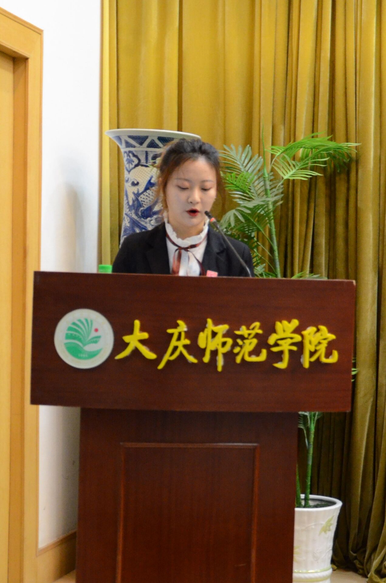 校企双方领导为共建班同学颁发专属徽章之后,学生代表王梓伊同学发言,表示非常能够有幸成为共建班的成员,能够接触和实践到先进、前沿的专业技术知识,在接下来的三年里不断积极学习专业知识、磨炼专业技能,成为适应新时代要求的应用型、复合型人才。然后,校企双方领导与新道云财务管理会计师班、新道数字营销班的同学们合影留念