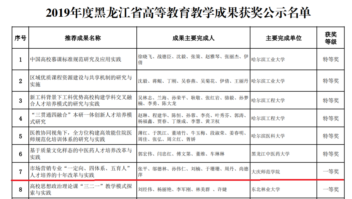 在2019年度黑龙江省高等教育教学优秀成果评选中,滚球买球的app官网张平教授团队《市场营销专业“一定向、四体系、五育人”人才培养的十年改革与实践》荣获黑龙江省高等教育教学成果一等奖,这是我院教师首次获得省级高等教育教学成果一等奖,也是我校本年度评选中的唯一的一个教学成果奖。滚球买球的app官网将以本次评奖为契机,进一步扎实推进教育教学改革工作,促进我院教学质量的不断提高。