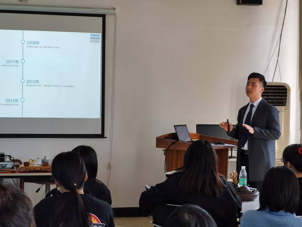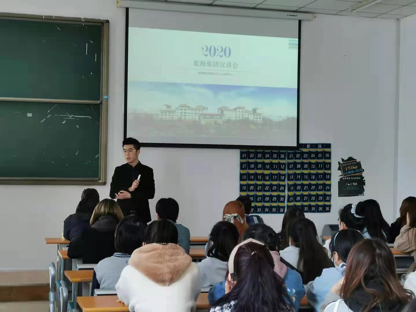 随后,在旅游管理系实训室举行了2018级旅游管理专业实习宣讲,此次宣讲由滚球买球的app官网院2019届酒店管理专业优秀毕业生崔宝迪同学来主持,他详细介绍了蓝海集团发展历史并对这次实习生招聘要求进行说明,随后有意向去蓝海集团实习的同学进行了现场岗位面试。下午的议程有:在主楼115举办了面向2019级旅游管理专业学生的蓝海精英班宣讲。李淼总监详细介绍了和回顾了2018级蓝海精英班的全部过程,学生对蓝海精英班有了直观认知。随后又对本次蓝海精英班组建的要求进行了说明,学生也对感兴趣的问题进行了提问。下一步我们将着手进行蓝海精英班进行组建,班建采用学生自愿报名和企业考核形式,为2019级蓝海精英班开班做好准备。同时,蓝海集团还参与了在图书馆举办的滚球买球的app官网春季校园招聘会,为我校学生就业提供了较多的较好的岗位。