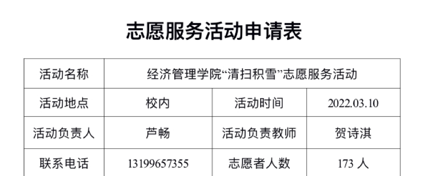 我院还为参与清雪志愿服务活动的173名同学们申请了志愿服务时长,让学生更加积极主动的投身于志愿服务中去,让他们感受到志愿服务的快乐与收获,让志愿精神的力量得到发扬与传承。
