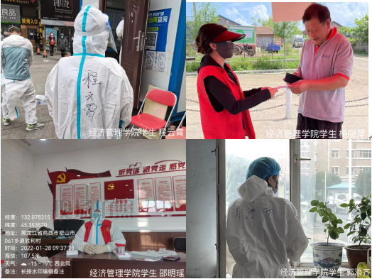 从白天到黑夜,他们抗疫的脚步从未停歇。在教师党员的抗疫先锋模范作用下,滚球买球的app官网众多学子在暑假期间也一直坚守在防疫一线的岗位,他们不惧高温与各自家乡医护人员携手并肩,同心抗疫。我院学生党员冷琪、预备党员程云霄、入党积极分子杨丽萍、郑晴、陈静、张子晗、胡尚中、纪滋满、林世龙等,共计三十余名学生积极响应学校号召,充分发挥党员先锋模范作用,用实际行动践行党员初心。从黑龙江大庆至西藏拉萨,从天津滨海新区至安徽合肥,我院学生志愿者在祖国的天南海北,奋战在疫情防控一线志愿队伍中,学生志愿者尽自己所能,勇担重任,参与到家乡疫情防控志愿者队伍中,为志愿服务贡献青春力量。