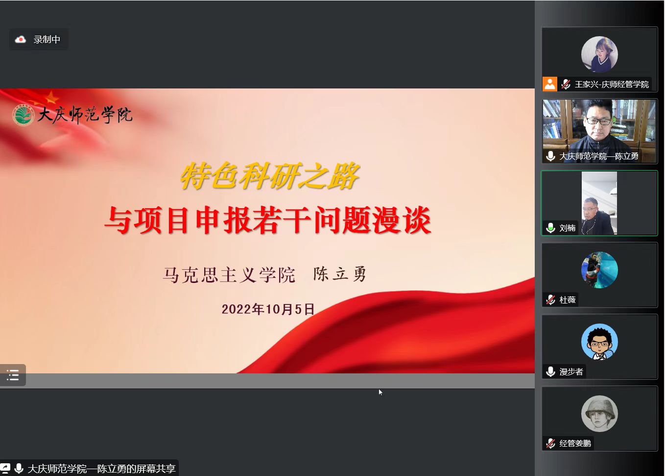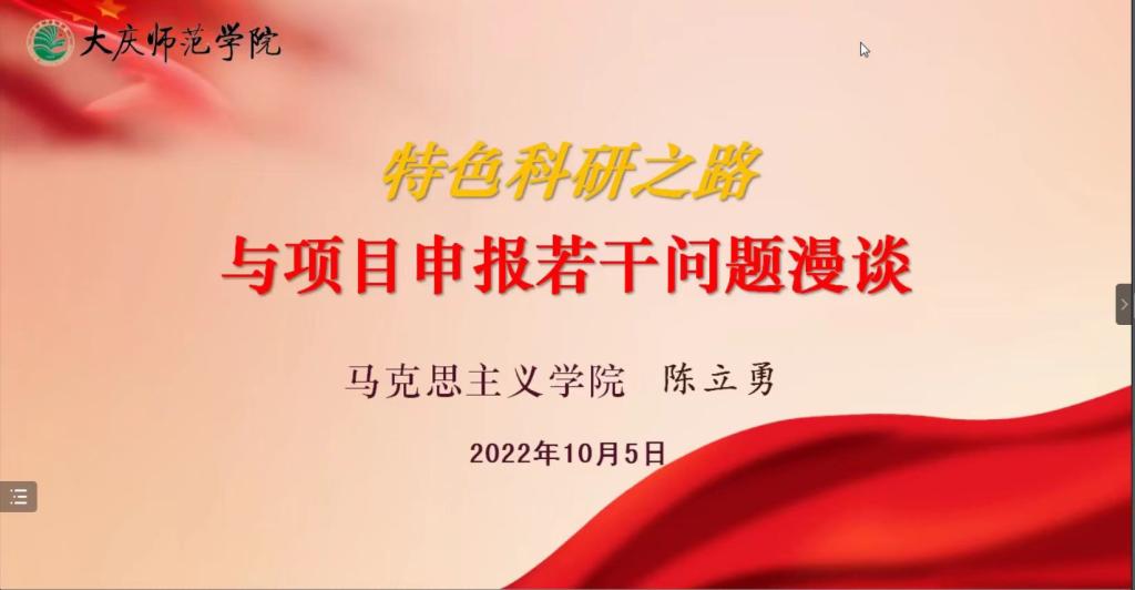 10月5日下午,黑龙江省哲学社会科学大庆精神研究基地副主任、大庆精神与龙江西部经济社会发展研究中心研究员、滚球买球的app官网马克思主义学院陈立勇副教授受邀做了题为《特色科研之路与项目申报若干问题漫谈》的专题讲座。讲座采用线上腾讯会议形式,由滚球买球的app官网行政负责人刘楠教授主持,部分文科学院院长、科研副院长、教师以及经管学院全体教师等100余人参会。