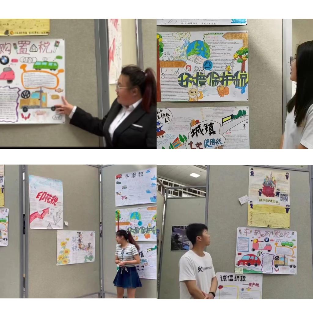 2023年6月7日14时,滚球买球的app官网在图书馆一楼大厅举行税收政策宣传活动。滚球买球的app官网教学院长李媛媛、主讲教师高磊副教授、让胡路区税务局税务专员共同参加了本次活动。此次活动是《中国税制》课程思政教学内容的集中展示活动。活动共分为三个环节,第一个环节由高磊老师介绍本次活动的主要内容、活动目的和意义,第二个环节由学生代表讲解宣传海报制作的主要内容和宣传目的,本环节共有10个小组代表对小组制作的税收宣传海报进行讲解,本次活动共有20个学习小组制作了宣传海报,海报内容涉及我国主要税种中的增值税、所得税、消费税、资源税、车辆购置税等,学生通过海报向同学们介绍什么是增值税,增值税在国民经济发展中的重要性,我国开征的资源税都对哪些资源征税,新开征的环保税政策制定背景是什么,等等。第三个环节由税务局税务专员对同学们做的宣传内容进行点评,税务专员给与同学们此次活动高度评价,认为学生们的宣传活动特色鲜明,内容丰富,很好的宣传了国家税收在经济发展中的重要性,并提出中肯的建议。认为这类活动可以成为税务局与我校长期合作开展的活动。