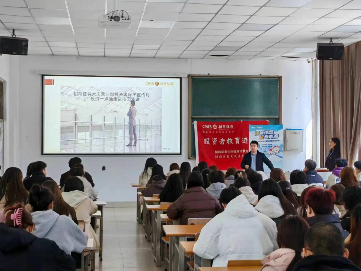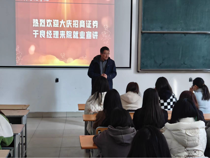 宣讲会上,招商证券大庆营业部于良经理分别从招商证券简介、招聘岗位、工作特点、加入方式等方面进行宣讲,详细介绍了招商证券公司的背景、业务范围、招聘岗位信息,并对公司的从业优势和招聘流程进行讲解。于良经理从自身经历出发,结合实践案例向学生们介绍了证券行业的现状及证券公司现有的业务情况,借助自身扎实的理论基础和丰富的实践经验,帮助同学们了解就业前景,同学们更清晰的找到了未来的就业方向和选择,。于良经理同时建议大家更多去了解并学习如何写简历,怎样能让自己的简历更丰富,简历是同学们进入就业市场的第一道门槛,大家要主动学习,并鼓励大家多去校外走动,去其他高校进行观察学习,丰富自己的知识。最后,于良经理向有志趣的同学发出诚挚邀请,欢迎能够加入招商证券团队。